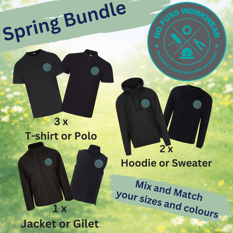 Yes. Every workwear bundle lets you mix and match sizes and colours across all garments. If you need a medium polo in navy, a large hoodie in black, and an XL t-shirt in grey - no problem. Just select your options when you order.
